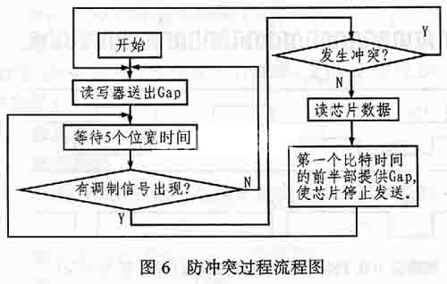 读写器组成由晶体振荡器(4MHZ)、分频器、功率放大器、GAP产生电路、包络检波、放大滤波整形电路、FSK解调电路、冲突检测电路和微控制器组成。下面主要介绍防冲突流程及冲突检测电路。